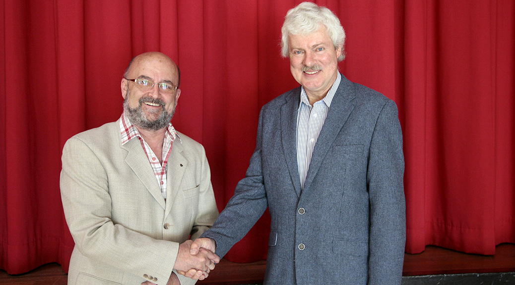 Das Foto zeigt den neu gewählten Vorsitzenden der Gemeindevertretung, Folke Müller (rechts) mit Helmut Kaffenberger, dem 1. Beigeordneten der Gemeinde Brensbach.