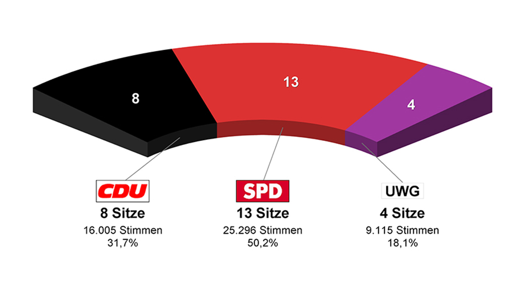 Die SPD verlor zwar ein Mandat, konnte aber die absolute Mehrheit mit einem Anteil von 50,2 Prozent im 25 Sitze umfassenden Parlament behaupten. Wie sich die Sitzverteilung in der Brensbacher Gemeindevertretung darstellt, ist auf dem oben gezeigten Schaubild zu ersehen.